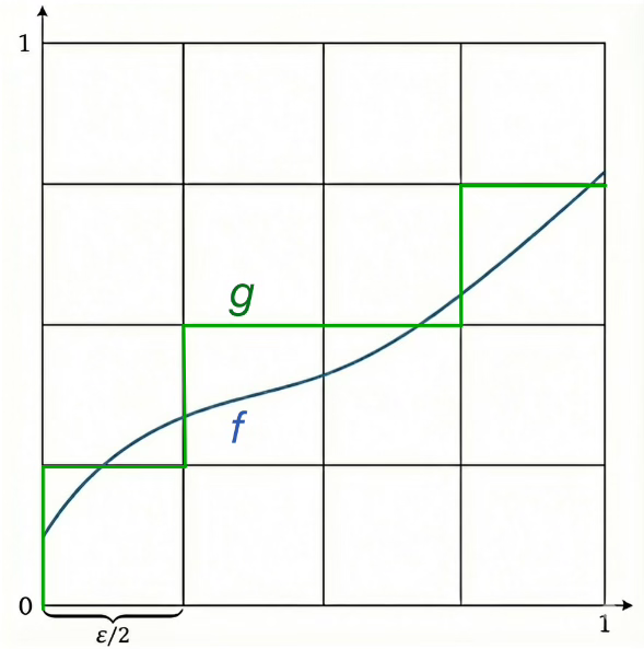 Now it remains to calculate the covering number \(\+N\tp{\+F, \norm{\cdot}_{\infty}, \eps}\). We discretize the domain \([0,1] \times [0,1]\) into a grid of scale \(\varepsilon/2\). As shown in the figure, any 1-Lipschitz function \(f\) (blue) can be approximated by a grid path \(g\) (green) within distance \(\varepsilon/2\).