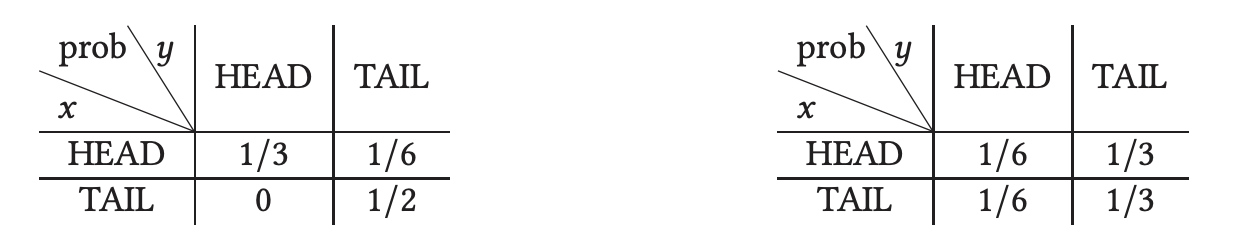 We now give a toy example about how to construct different couplings on two fixed distributions. There are two coins: the first coin has probability \(\frac{1}{2}\) for head in a toss and \(\frac{1}{2}\) for tail, and the second coin has probability \(\frac{1}{3}\) and \(\frac{2}{3}\) respectively. We now construct two couplings as follows.