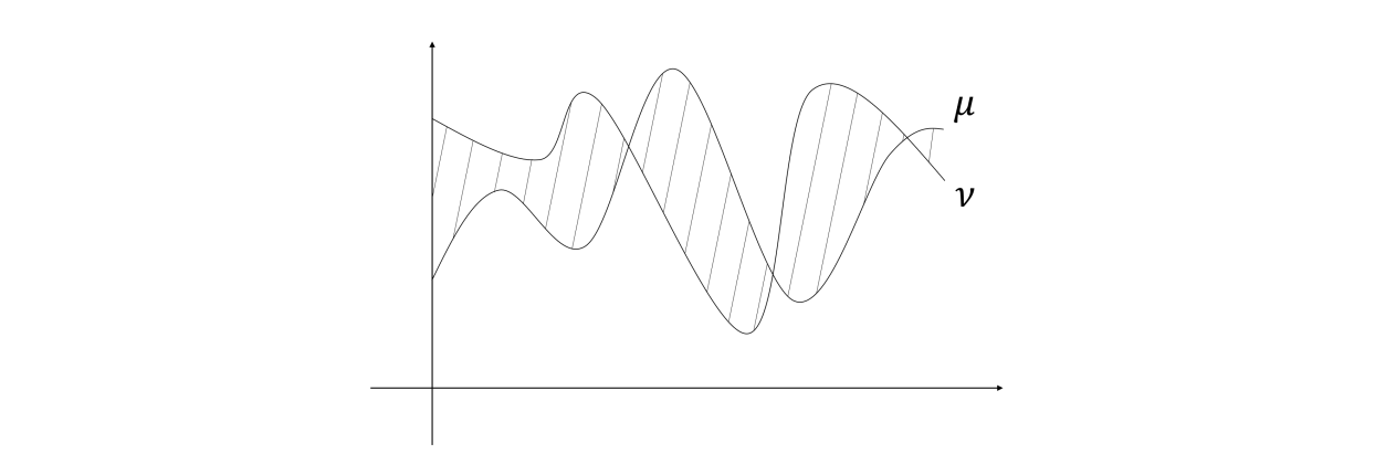 We can look at the following figure (for pdf) of two distributions on the same sample space. The total variation distance is half the area enclosed by the two curves.