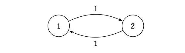 Definition 4 (Aperiodicity) A Markov chain is aperiodic if for any state \(v\), it holds that \[ \gcd\set{\abs{c} \mid \ c \in C_v} = 1, \] where \(C_v\) denotes the set of the directed cycles containing \(v\) in the transition graph.