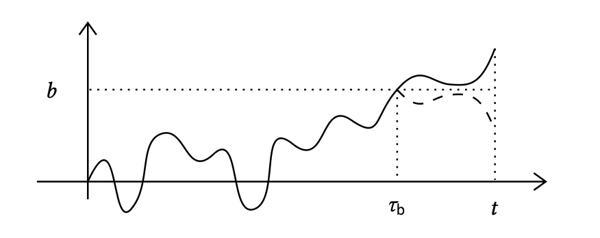 We consider the first arrivial time of position \(b\) in a Brownian motion. This is called the hitting time of \(b\). Define \[ \tau_b := \inf \left\{ t \geq 0 \mid W(t) > b \right\} \] For any \(t>0\), \[\begin{align*} \Pr{\tau_b \le t} &= \Pr{\tau_b \le t \wedge W(t) \le b} + \Pr{\tau_b \le t \wedge W(t) > b}\\ &= \Pr{W(t) > b} + \Pr{ W(t) \le b\mid \tau_b \le t }\cdot \Pr{\tau_b \le t }. \end{align*}\]