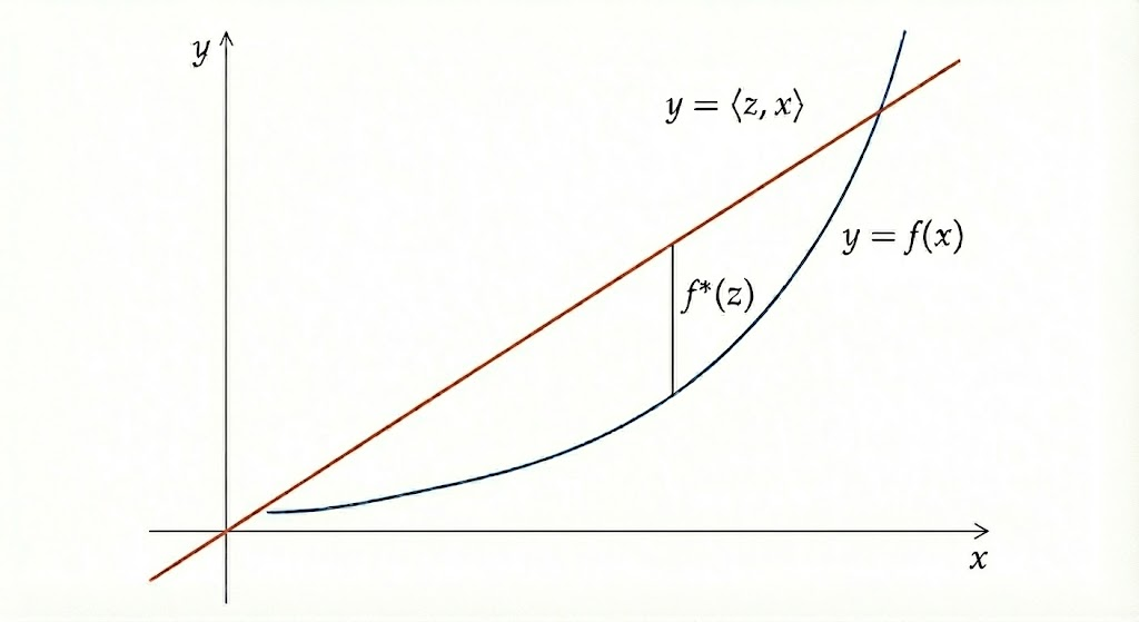 We will prove that for a non-negative random variable \(Z\), the entropy \(\Ent{Z}\) can be expressed as the solution to an optimization problem: \[ \Ent{Z} = \sup_{X}\set{\E{ZX}:\ \E{e^X}=1}. \] To derive this, we rely on convex duality. Recall that for a function \(f:\mathbb{R}^d\to \mathbb{R}\), its Fenchel dual (or convex conjugate) is defined as: \[ f^*(z) =\sup_{x\in \bb R}\set{\inner{z}{x} - f(x)}. \]