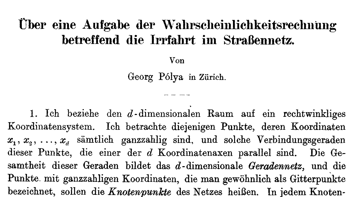 这也就是波利亚证明的,当考虑在 \(n\) -维格点 \(\mathbb{Z}^n\) 上的随机游走的时候,对于 \(n\le 2\),\(\Pr{T<\infty}=1\),而对于 \(n>2\),\(\Pr{T<\infty}<1\)。
