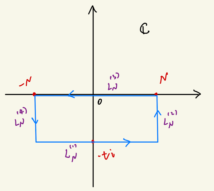 \] 这是一个在复平面上的积分,我们的积分范围是 \(\Im z = -t\) 的直线。对于给定的 \(N>0\),我们计算如下图所示的围道积分。