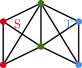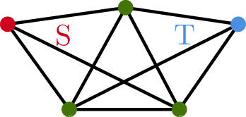 注意到 \[ \begin{align*} &\phantom{{}={}}\E{X^2}-\tp{\E{X}}^2\\ &=\E{\tp{\sum_{S\in \binom{[n]}{4}}X_s}^2}-\tp{\E{\sum_{S\in \binom{[n]}{4}}X_s}}^2\\ &=2\sum_{S\neq T}\E{X_SX_T}+\sum_S \E{X_S^2}-2\sum_{S\neq T}\E{X_S}\E{X_T}-\sum_{S}\tp{\E{X_s}}^2\\ &=2\sum_{\abs{S\cap T}=2}\tp{\E{X_SX_T}-\E{X_S}\E{X_T}}+2\sum_{S\cap T=3}\tp{\E{X_SX_T}-\E{X_S}\E{X_T}}\\ &\quad+ \sum_{S}\tp{\E{X_S^2}-\tp{\E{X_S}}^2}\\ &\leq 2\sum_{\abs{S\cap T}=2}\E{X_SX_T}+2\sum_{S\cap T=3}\E{X_SX_T} + \sum_{S}\E{X_S^2}. \end{align*} \] 正如 Figure 1 所示,当 \(\abs{S\cap T}=2\) 时, \(X_S= X_T=1\) 当且仅当这 \(11\) 条边都被包含。因此 \[ \E{X_SX_T}=\Pr{X_S=1\wedge X_T=1}=p^{11}. \] 类似地,当 \(\abs{S\cap T}=3\)(如 Figure 2 所示),