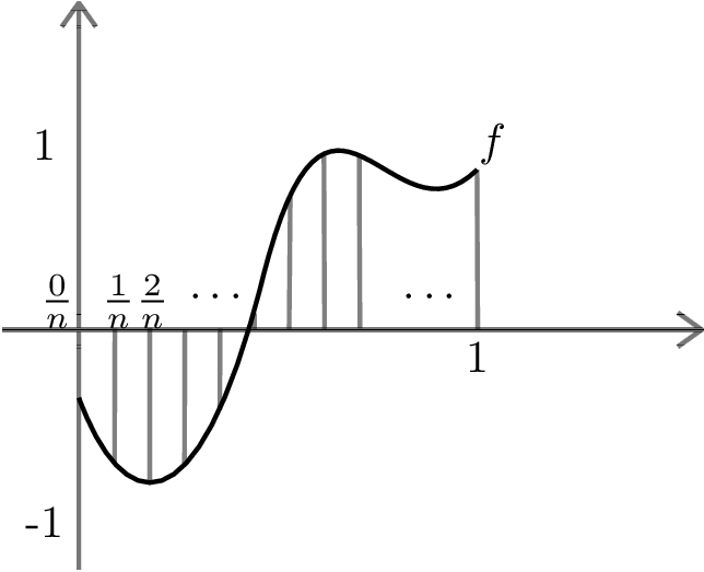 我们可以用以下的观点来看待这个问题:如 Figure 3 所示,我们从函数中选定 \(n+1\) 个点,第 \(i\) 个点的取值为 \(f\tp{\frac{i}{n}}\)。然后我们定义 \[ P_n(x)=\sum_{i=0}^n E_i(x)\cdot f\tp{\frac{i}{n}}. \] 我们希望 \(E_i(x)\) 满足下列条件: